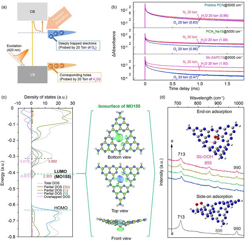 3.结合实验和理论研究,我们发现溶解在水中并由4e-WOR生成的O2均参与了2e-ORR生成H2O2的过程。单个Sb位点能够积累电子,这些电子通过2e- ORR途径充当O2的光还原位点。同时,与Sb位点相邻的元素单元的N原子上的累积空穴加速了水的氧化动力学。