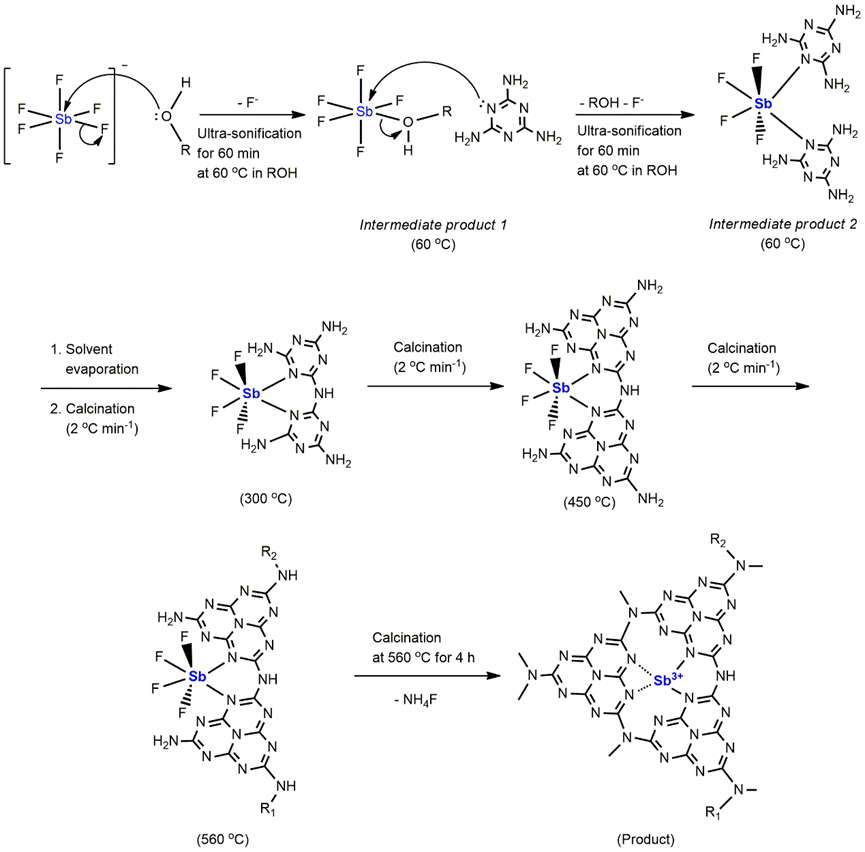 Sb-SAPC由自下而上的方法制备:一定量的NaSbF60.5 mmol,1 mmol,3 mmol,5 mmol,10 mmol,15 mmol20 mmol将其在60°C超声处理下溶于30 mL乙醇60分钟,然后加入4 g三聚氰胺通过旋转蒸发仪和真空烘箱的组合除去溶液中的溶剂。将得到的白色粉末转移到管式炉中。N2气氛中以2°C min-1的升温速率将炉温从25°C升高至560°C,然后在560°C保持4 h。热处理后,在连续不断的N2流动下,将炉自然冷却至25°C (2)。