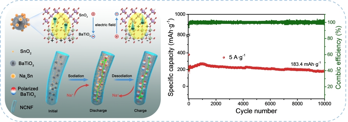 该项工作首次提出BaTiO3的铁电效应和压电效应产生的局部微电场在促进钠离子扩散和提高SnO2负极的倍率性能方面起着突出的作用,特别是铁电性的作用不可忽视。实验结果证实铁电效应来自于外部电场对BaTiO3的极化使其电荷分离,其引起的局部微电场起主导作用,而压电效应来自于SnO2体积膨胀产生应力对BaTiO3的挤压可增强该微电场。该研究阐明了即使体积效应作用下的BaTiO3的极化方向是任意的,SnO2/BaTiO3复合材料仍能加速钠离子传输的机制。因此,氮掺杂的碳纳米纤维包覆的SnO2/BaTiO3复合材料用作钠离子电池负极,表现出优异的快充性能和长循环能力,在大电流密度下可循环10000圈。该研究结果对于设计新型合金基复合材料实现可快充碱金属离子电池具有重要的指导意义。