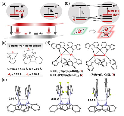 Figure 1.(a) Illustration of the orbital diagrams and decay dynamics (krandknr) of3MLCT and3IL excited states. (b) The formation and orbital diagrams of MMLCT excited states for square-planar Pt(II) complexes. (c) Trigonometry analysis of the intermetallic distance dependent on the bridging ligand. (d) Chemical structures and (e) perspective view of the single crystal structures of the dinuclear Pt(II) complexes13in this work.