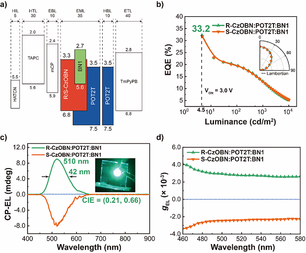 针对上述问题,芒果体育杨楚罗教授课题组提出了一种简单有效的策略,将手性给体和非手性受体分子进行搭配构筑手性激基复合物作为主体,非手性多重共振-热活化延迟荧光(MR-TADF)材料作为客体,实现了窄带发射的高效率圆偏振电致发光,其电致发光的半峰宽(FWHM)为42 nm, 最大外量子效率EQE可达33.2%,电致发光不对称因子(gEL)为2.8 × 10-3(图1),是目前报道的窄光谱圆偏振OLED器件的最高效率。该工作通过手性激基复合物主体诱导非手性的客体产生了圆偏振电致发光,为实现高效率和高不对称因子的圆偏振电致发光提供了一种简单通用的策略,预期将对CP-OLED器件的发展起到很好的推动作用。