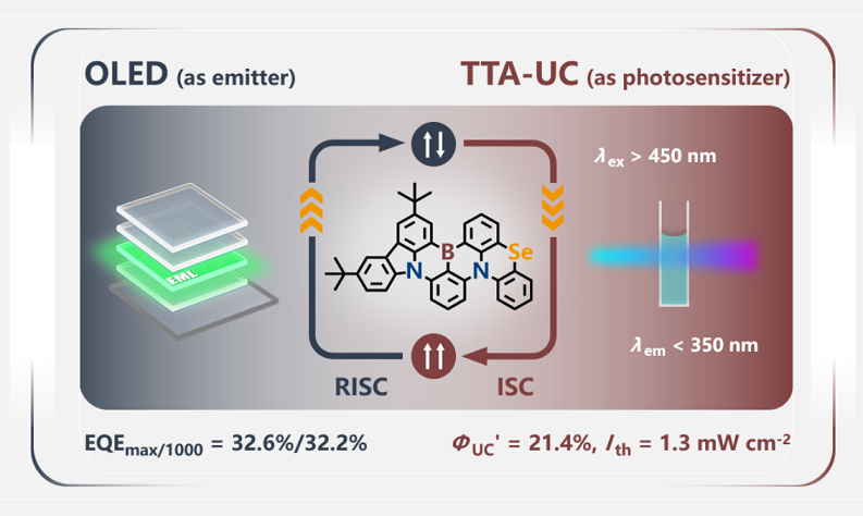 一箭双雕:芒果体育材料学院杨楚罗教授团队在JACS上发表同时实现高效窄谱带OLED和可见-紫外光子上转换的含硒热活化延迟荧光材料