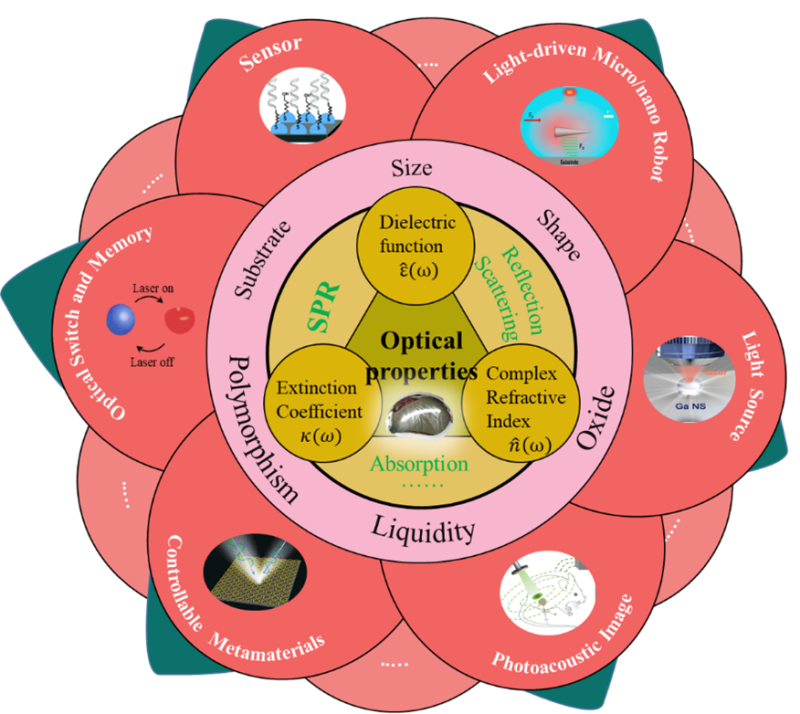 镓基液态金属是一种新兴材料,室温下呈液态,具有流动性、导电性等特点,在软性电子、化学合成等领域得到了广泛的研究和发展,推动现代医学和相关工业快速发展,例如疾病成像、光热治疗和传感器检测等。此外,镓基液态金属由于其独特的多态性、过冷现象,可以实现宽带可调谐的等离子共振,并呈现出特征性的光学响应。然而,尽管现有的综述已经从光子学的角度总结了镓基液态金属的应用,但在系统介绍镓基液态金属的光学性质及其基本原理方面存在空白。镓基液态金属在光学开关与存储器、光学传感器等方面具有广泛应用。