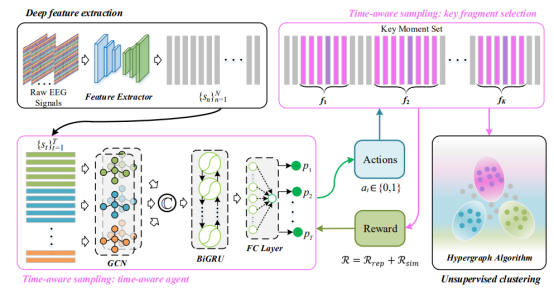 在本文中,我们将从EEG时间序列中挖掘关键情感片段的过程形式化为马尔可夫决策过程,并通过DRL训练生成一个时间感知代理,无需使用标签信息。首先,时间感知代理从特征提取器获取深度特征作为输入,并生成样本级的重要性分数,反映了每个样本包含的情感相关信息。然后,基于获得的样本级重要性分数,我们保留与情感高度相关的前X个连续EEG片段,同时丢弃其余部分。最后,我们将这些连续片段视为关键情感片段,并将它们输入到一个超图解码模型中,以进行无监督聚类。