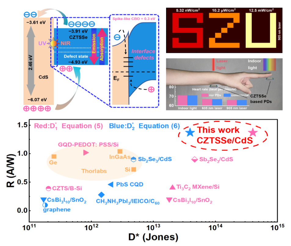 工作在近红外波段(700-1400 nm)的光电探测器可广泛应用于机器视觉、生物认证、物料分拣、健康检测、安全监控等领域。硅(Si)基光电探测器具有优异的稳定性和成熟的制备工艺,已商用化于可见光探测,然而,其固有检测范围限制了近红外区域的应用。铟镓砷(InGaAs)、锑化铟(InSb)和碲镉汞(HgCdTe)可用于制备红外光电探测器,但是,它们需要贵金属源、高质量的单晶衬底和复杂的真空工艺,且通常具有较高的器件暗电流,因此主要在军事和工业上应用,在民用领域的发展受限。基于此,开发新型高性能低成本的可见-近红外光电探测器是相关领域的关键挑战之一。芒果体育梁广兴研究员课题组在铜锌锡硫硒(CZTSSe)薄膜光电探测器研究方向取得重要突破。基于空气中稳定的乙二醇甲醚溶剂体系,采用溶液旋涂结合后硒化热处理生长高质量的CZTSSe光吸收层薄膜,结合CZTSSe/CdS异质结界面优化,系统调控载流子动力学,成功构建出高性能自驱动CZTSSe薄膜光电探测器。该器件具有300-1300 nm的宽光谱响应(近期已拓展至1700 nm,可覆盖三个通讯波段),响应度达到1.37 A/W,在5 nW/cm2下的探测度高达4.0 × 1014 Jones,线性动态范围(LDR)为126 dB,LDR内的最大光开关比为1.3 × 108,同时具有超快的响应速度(上升/下降时间为16 ns/85 ns),与目前商用或报道较为先进的光电二极管相比也体现出性能优势。此外,该薄膜光电探测器在极弱光探测(低至718 pW)、近红外光成像及基于光电容积描记技术(PPG)的心率监测和血氧测试等领域展现应用潜力,相关研究成果发表在SusMat(影响因子28.4-中国科技卓越行动计划-高起点新刊),梁广兴为第一作者,其指导的硕士研究生李传昊为第二作者,梁广兴和陈烁是本文通讯作者,芒果体育为第一通讯单位。