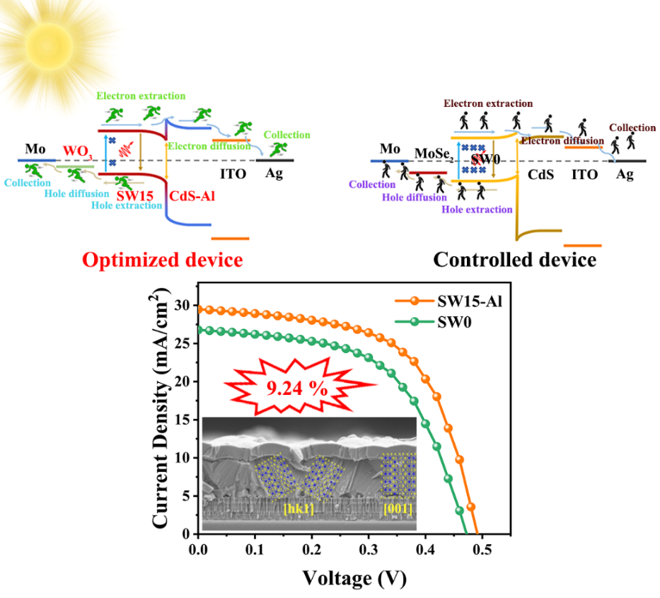 近年来,硒化锑(Sb2Se3)凭借原材料绿色低毒、价格低廉、一维独特结构贡献良性晶界、二元单相组成易于制备、理想带隙匹配高吸光系数、优异的载流子迁移率及介电常数等优势,在新型高效低成本薄膜太阳电池研究领域引起广泛关注。尽管Sb2Se3薄膜太阳电池在环境友好方面具有优胜之处,但和铜铟镓硒(CIGS)薄膜太阳电池性能相比还有很大差距,整体表现为电池开路电压亏损偏高,这主要是由于光生载流子在电池内部的非辐射复合损失严重所导致的,本文深入研究埋层界面和异质结性能调控,剖析薄膜生长动力学且实现光吸收层取向可控生长,优化异质结能带匹配和裁剪背接触势垒,从而降低太阳电池的非辐射复合损失,提高光生载流子传输效率,最终获得目前已报道基于真空溅射法构建底衬Sb2Se3薄膜太阳电池的最高光电转换效率9.24%,属于国际领先水平,相关研究成果发表在Advanced Materials(影响因子29.698,中科院JCR一区,Top期刊)上,梁广兴研究员为论文通讯作者,其指导的博士研究生陈国杰为论文第一作者,芒果体育为唯一通讯单位。