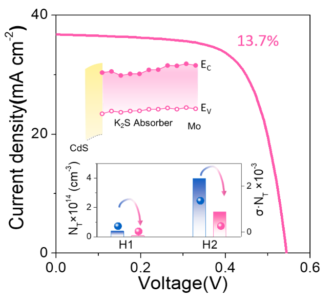锌黄锡矿半导体Cu2ZnSn(SSe)4(CZTSSe)同样是因为其元素廉价无毒以及具有大于32%的理论光电转换效率成为很有前途的新型薄膜光伏材料之一。近年来CZTSSe薄膜太阳电池的效率不断攀升,但仍远低于其理论值,这主要归因于带隙和电位明显的波动,较短的少数载流子寿命以及缺陷引起的严重载流子复合;铜铟镓硒(CIGS)的成熟经验证明双梯度带隙结构使太阳电池兼具良好的电子输运特性和较高的开路电压,然而实现双梯度带隙结构对高温硒化成膜的CZTSSe太阳电池来说极具挑战。本文通过调整前驱体薄膜中K2S层的位置和K2S溶液的浓度,可实现调控带隙最小值(缺口)的位置和深度,避免由于不合适的前梯度起始位置和不理想的带隙缺口而产生的电子屏障;晶粒生长过程中K和Se的高亲和能容易形成K2Se3等K-Se液体中间相,它们沿着薄膜内的空隙和晶界流动,不仅降低熔点加速硒化,还可作为硒源使薄膜的硒化更加充分;碱金属K的引入促进了晶粒生长过程中各元素的扩散,使吸收层更大比例的组分参与晶粒生长,从而稳定Sn含量,深能级缺陷VSn和CuSn得到抑制,最终构建出CZTSSe薄膜太阳电池光电转换效率达到13.7%,属于国际领先水平,相关研究成果发表在Advanced Functional Materials (2023)2311992(影响因子:19.0,中科院JCR一区,Top期刊),梁广兴和苏正华为通讯作者,其指导的联合培养博士生赵云海为第一作者,芒果体育为唯一通讯单位。