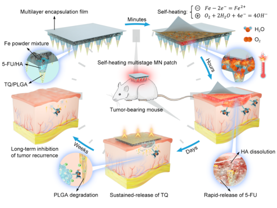 皮肤癌是最常见的肿瘤之一,发病率逐年增高,严重威胁人类的生命健康。微针给药技术,作为《环球科学》评选的2020年有望改变世界的十大新型技术之一,在皮肤癌的治疗中展现出独特的优势。该研究团队开发了一种具有多级结构的微针药物递送系统,包括:(1)用于持续药物释放的可降解针尖;(2)用于快速药物释放的可溶性微针基底;(3)用于自发热材料储存的背衬层。其中,微针基底由生物医用高分子透明质酸(HA)组成,治疗时可快速溶解,释放抗肿瘤药物5-氟尿嘧啶(5-FU)进行高效的皮肤癌治疗。针尖则由具有适当生物可降解性能的聚乳酸-羟基乙酸共聚物(PLGA)组成,治疗时随着基底的溶解,针尖脱落并长期滞留在病灶部位,可实现抑瘤药物百里醌(TQ)的缓释,长效抑制皮肤癌复发。背衬层内则填充了自发热材料,基于微米级铁粉的氧化放热反应,使得微针给药系统具有高效的自发热性能。分别通过系统的体外和体内实验,验证了其优异的程序化药物释放性能,良好的皮肤癌治疗效果,且可以长效抑制肿瘤复发。自发热效应不仅实现了一定的皮肤癌热治疗效果,更重要的是,它表现出非常好的热促进药物释放效果,在药物递送速率、渗透深度、给药量等方面都有很大的提升。这种具有多级结构的自发热微针载药贴片具有巨大的临床应用前景,特别是在皮肤癌治疗方面。