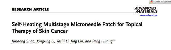 近日,芒果体育医学部生物医学工程学院黄鹏特聘教授团队在国际顶级学术期刊《Advanced Materials》(影响因子29.4,中科院一区,TOP期刊)上发表了题为《Self-Heating Multistage Microneedle Patch for Topical Therapy of Skin Cancer》的研究论文。这篇论文的所有工作均在芒果体育完成,该团队邵俊东副研究员(现为广州医科大学教授)和研究生李星星为论文共同第一作者,黄鹏教授为独立通讯作者,芒果体育为唯一单位和唯一通讯单位,该团队所在的生物医学工程学科属于广东省优势重点学科。