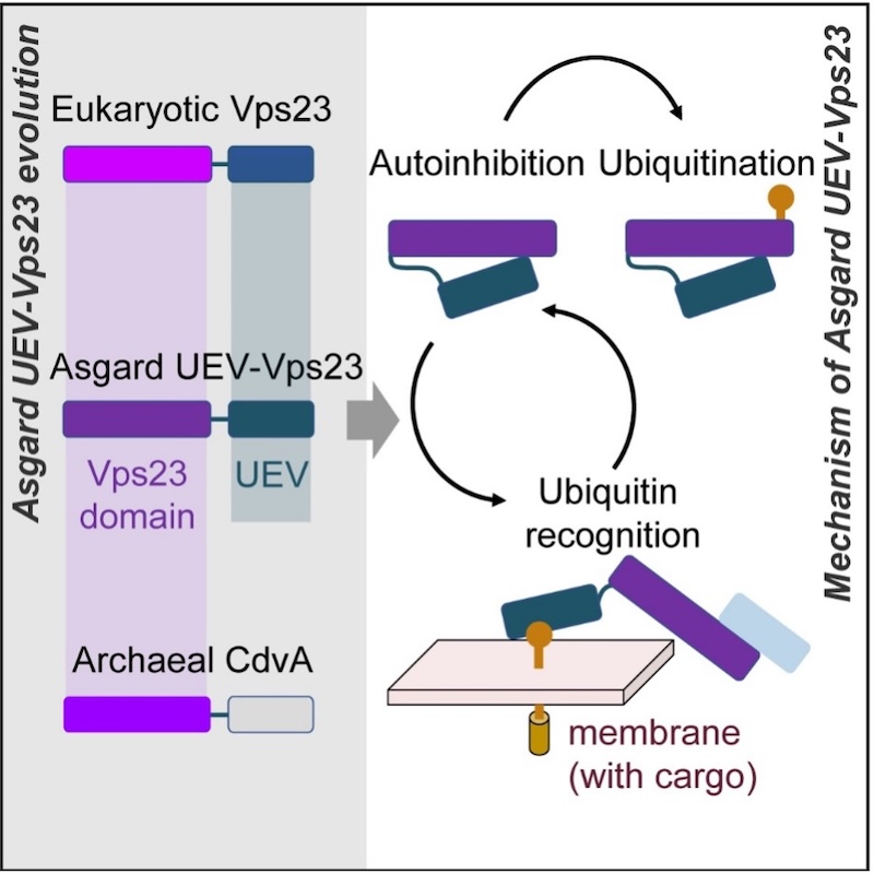 李猛教授研究团队以阿斯加德古菌ESCRT核心功能亚基UEV-Vps23为研究切入点(图1),发现该亚基的蛋白结构域包括UEV和Vps23 domain;其中UEV介导该亚基识别古菌泛素分子,Vps23 domain可被古菌泛素修饰系统标记修饰,并且UEV和Vps23 domain通过相互作用使该亚基呈现的自抑制状态,可能是调节阿斯加德古菌ESCRT和泛素修饰系统之间功能协作的重要分子基础。此外,研究团队首次提出阿斯加德古菌UEV-Vps23可能起源于基因融合,该亚基是古菌CdvA向真核生物Vps23演化的“过渡版本”,进而为阿斯加德古菌向真核生物演化过程中新基因起源模式提供科学依据。