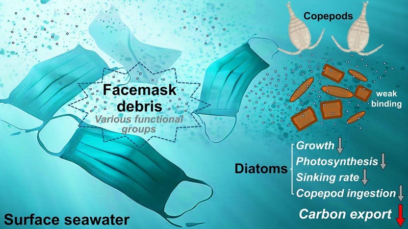 废弃的外科口罩已成为海水中塑料垃圾的新来源,在老化过程中能释放出大量微米和纳米级塑料碎片。然而,关于这些污染物如何影响海洋浮游植物却鲜有报导。该研究将口罩浸出物加入羽纹纲硅藻三角褐指藻和中心纲硅藻威氏海链藻的培养基,发现口罩碎片虽不能牢固吸附于硅藻表面,但仍可抑制其生长和光合作用,并显著改变细胞硅质壁的理化性质。在纳米尺度上,硅藻细胞壁的电势、粘附力和含氧化合物比例降低,同时粗糙度和弹性模量有所提高。此外,在共暴露条件下,桡足类对硅藻的摄食量大幅减少,且硅藻的沉降速率显著下降。这些结果表明,口罩碎片对硅藻的影响有可能在一定程度上减缓有机碳从表层海水向深海的输出。