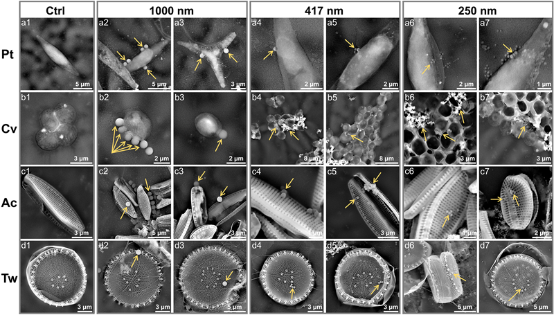 微塑料带来的海洋污染对浮游植物构成重大威胁,但目前人们对微塑料与微藻细胞之间的物理相互作用仍知之甚少。该研究使用原子力显微镜探索了经海水老化的微塑料与四种代表性微藻的接触模式。共暴露七天后,微藻的特定部位出现了因物种和微塑料粒径而异的畸形。通过镶嵌或内陷的方式,微塑料可分别吸附于多孔或光滑的细胞表面,从而导致细胞壁出现轻微形变或明显皱褶。此外,微塑料甚至可侵入微藻细胞体内,但这种现象在典型硅藻中较少出现,因为硅藻外壳具有能“捕获”微小颗粒的分层多孔结构。该工作首次在纳米尺度上揭示了由微塑料导致的物种特异性微藻表面形变。