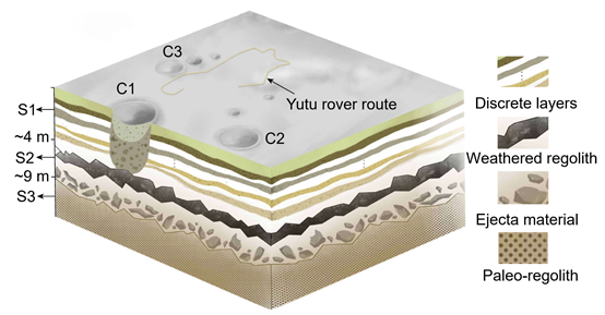 图1.嫦娥三号着陆区浅层月壤内离散层结构及其形成机制解释示意图