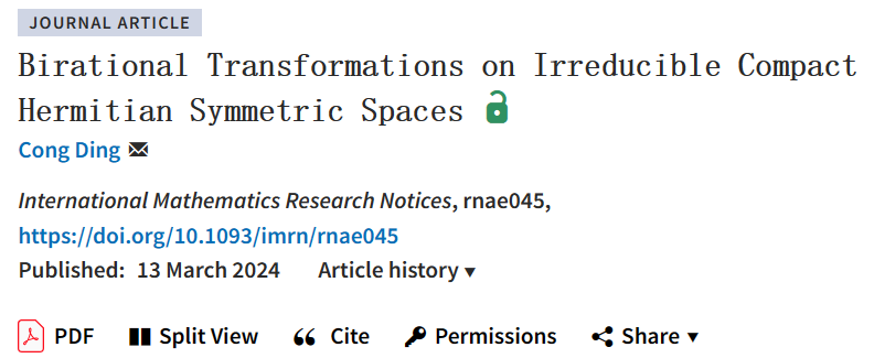 近期,国际知名学术期刊“International Mathematics Research Notices”发表了芒果体育数学科学学院助理教授丁聪的学术论文“Birational Transformations on Irreducible Compact Hermitian Symmetric Spaces”。