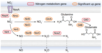 为进一步探索微生物群落中氮代谢功能的变化,本研究分析了与氮循环相关的代谢通路与功能基因,发现ICPB反应后与氮循环相关的代谢通路和功能基因丰度均显著增加(图5)。此外,本研究还推断了ICPB系统中可能存在的硝酸盐代谢途径(图6)。通过对反硝化代谢相关基因的定量分析,ICPB系统在基因水平上对氮的去除潜力得到了证明,这有利于进一步研究ICPB的反硝化机制。