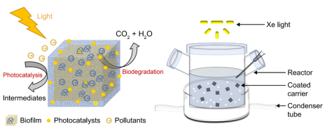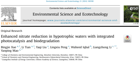 芒果体育化学与环境工程学院毛艳萍课题组在期刊《Environmental Science and Ecotechnology》(影响因子12.6,中科院JCR 1 区)上发表了题为《Enhanced nitrate reduction in hypotrophic waters with integrated photocatalysis and biodegradation》的论文。芒果体育化学与环境工程学院硕士研究生薛冰洁和田里为论文共同第一作者,芒果体育化学与环境工程学院为第一署名单位。