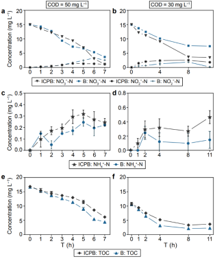 图3 ICPB和生物降解(B)过程中NO3−, NO2−(a, b), NH4+(c, d) 和 TOC (e, f)的浓度变化