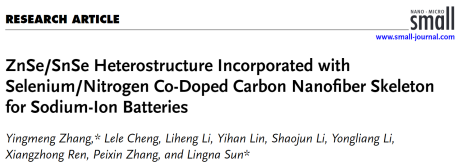 为解决金属硫族化合物作为钠离子电池负极材料时,在转化-合金化过程中伴随着的体积膨胀变形和活性材料粉化导致电极接触减弱,从集电器上剥落等问题,孙灵娜教授团队首先将ZnSn(OH)6纳米盒状前驱体与聚丙烯腈(PAN)进行静电纺丝,得到三维自支撑网络,经过碳化和硒化热处理后,开发出嵌入Se/N共掺杂CNF骨架中的ZnSe/SnSe异质结构(ZnSe/SnSe@Se,N-CNFs)。独特的ZnSe/SnSe异质结构、静电纺丝CNF和Se/N共掺杂特性可有效促进电子/离子传输速率,提高结构稳定性,加速电化学反应动力学:I) ZnSe/SnSe中的异质边界将提供增强的界面耦合效应和内置电场,具有额外的电荷转移驱动力,可吸引更多Na+离子吸附在异质界面上,提高Na+离子从电解液到电极的迁移速率,从而有效加速电化学反应动力学。Ⅱ) 嵌入ZnSe/SnSe纳米盒的三维自支撑CNF网络不仅能增强半导体ZnSe/SnSe的导电性,还能避免在嵌入/脱出过程中发生剧烈的体积膨胀/收缩,改善其结构的完整性。Ⅲ) Se/N共掺杂特性实现了CNF基体与硒化异质结构之间的耦合效应,实现了离子/电子的快速传输,加速了钠离子储存的表面/内部反应动力学,并增强了CNF基体的电子导电性和电解液润湿性。这项研究为解决目前合金基材料在钠离子电池中所面临的挑战提供了一些具有启发性的设计思路:通过异质纳米结构构建、碳壳涂层和共掺杂改性策略,提高了导电性;通过将合金材料嵌入具有三维独立骨架特征的碳基体,解决了体积膨胀问题。该论文《ZnSe/SnSe Heterostructure Incorporated with Selenium/Nitrogen Co-Doped Carbon Nanofiber Skeleton for Sodium-Ion Batteries》发表在《Small》(影响因子13.3,中科院JCR 2 区),芒果体育化学与环境工程学院张颖朦研究员、硕士研究生程乐乐为共同第一作者,张颖朦研究员、孙灵娜教授为共同通讯作者,芒果体育化学与环境工程学院为通讯单位。