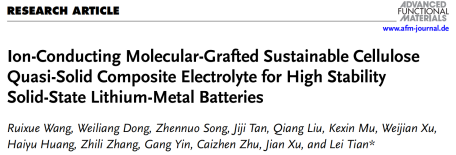 Ruixue Wang, Weiliang Dong, Zhennuo Song, Jiji Tan, Qiang Liu, Kexin Mu, Weijian Xu, Haiyu Huang, Zhili Zhang, Gang Yin, Caizhen Zhu, Jian Xu, and Lei Tian*, Ion-Conducting Molecular-Grafted Sustainable Cellulose Quasi-Solid Composite Electrolyte for High Stability Solid-State Lithium-Metal Batteries.Adv. Funct. Mater.2024, 2402461.