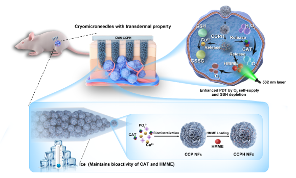 微针给药技术在无痛和精准给药方面展现出巨大潜力,尤其在皮肤癌的治疗中具有独特的优势。目前可用的溶解微针主要是在室温下制造和保存的,因此不利于不稳定PS的递送。近日,该研究团队开发了一种多功能冰微针药物递送系统(简称:CMN-CCPH),首先制备了负载有光敏剂血卟啉单甲基醚(HMME)的磷酸铜矿化过氧化氢酶(CAT)纳米花(CCPH),然后装载在特殊工艺制备的冰微针贴片中,CMN-CCPH可高效地维持HMME和CAT的生物活性,显著地提高了HMME的生物利用度和PDT的疗效。同时,利用荧光(FL)/光声(PA)成像进行实时监测,不仅有助于可视化肿瘤内HMME的富集,还可以评估血红蛋白氧饱和度(sO2)。通过可视化的FL/PA双模态成像,优化了异质性恶性肿瘤的PDT治疗参数,大大地增加了PDT治疗参数选择的灵活性,并为PDT潜在适应症的伴随诊疗提供了理论支撑。