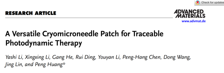 近日,芒果体育医学部生物医学工程学院黄鹏特聘教授团队在国际顶级学术期刊Advanced Materials(影响因子29.4,中科院一区,TOP期刊)上发表了题为《A Versatile Cryomicroneedle Patch for Traceable Photodynamic Therapy》的研究论文。这项研究的所有工作均在芒果体育完成,该团队研究助理李雅诗、研究生李星星和博士后贺港为论文共同第一作者,黄鹏教授为唯一通讯作者,芒果体育为唯一通讯单位,该团队所在的生物医学工程学科属于广东省优势重点学科。