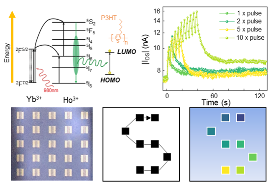 通过传感器内计算开发能够检测和识别运动目标的神经形态硬件是构建分布式计算边缘计算系统的重要组成部分。除了对可见光的反应外,神经形态硬件还应具有感知和处理非可见光的能力,这对于在特殊环境中跟踪目标物体轨迹至关重要。通过将掺杂的LaF3: Yb/Ho上转换量子点(UCQDs)加入到基于聚3-己基噻吩(P3HT)的有机场效应晶体管(FET)的通道中,制备了具有近红外(NIR)响应的有机突触晶体管,作为电荷捕获和红外传感位点。所获得的突触晶体管不仅复制了近红外光照下常见的突触行为,而且还展示了在黑暗条件下动物动态轨迹识别的潜在应用。与其他监测技术相比,掺有LaF3: Yb/Ho UCQDs的P3HT晶体管在近红外响应、高效计算和灵敏度等方面具有明显的优势,为今后的研究提供了实验基础,为下一代智能动态图像识别系统的开发提供设计参考。此项研究得到国家自然科学基金、英国皇家化学会、射频异质异构集成全国重点实验室自主课题、广东省基础与应用基础研究基金、深圳市科创局、芒果体育与台北科技大学2024年合作研究的资助。