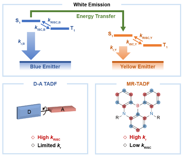 Fig. 1 | Design strategy.Schematic representation of the strategy developed in this work:employing D-AtypeTADF materials (lower left) with rapidkRISCastheblue emitter and MR-TADF materials (lower right) with fastkras the yellow emitter. B, Y, D, A,kRISC,kISC, andkrrefer to blue emitter, yellow emitter, donor, acceptor,reverse intersystem crossing rate, intersystem crossing rate, and radiative decay rate, respectively.