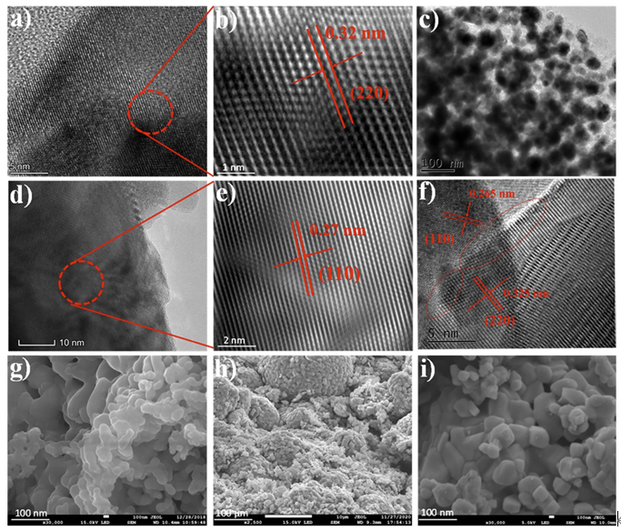Fig. 3. a-fHigh-resolution transmission electron microscope images representing the microstructure included the calculated lattice spacing and particle distribution with hetero-interfaces at the particles-level of CCTO, NCAL, and CCTO–NCAL heterostructure.g–iField emission-scanning electron microscopy images depicting: the surface morphology and particles distribution of the CCTO, NCAL, and CCTO–NCAL heterostructure.