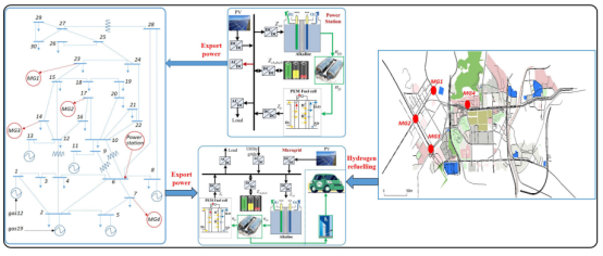 HFCEV的加氢仍然是一个亟待解决的问题。本文提出一种基于氢电微网来生产氢气,为HFCEV加氢,并提出了不同的策略来引导HFCEV在交通网络与电力系统耦合下的加氢行为。首先,根据实际交通网络构建HFCEV交通流模型。其次,建立实时仿真算法。第三,构建基于氢气的微电网为HFCEV加氢。第四,建立IEEE 30节点电网输出功率模型。最后,提出通过交通网络与电力网络的耦合实现HFCEV实时加氢。耦合结构如图1,并比较了不同的HFCEV加氢策略(固定价格、动态价格、LSTM决策价格)。结果表明,在动态价格下,交通网络的拥堵得到改善,等待时间减少了17.71%,网络的时间损失减少了13.29%。通过合理的价格引导,车辆会选择指定的站点进行氢气加注,并影响交通网络车流量的时空分布。此外,通过调整发电站输出功率和加氢站输入功率,可以改善电力系统的电压条件。