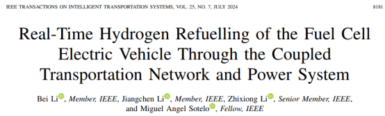 近日,芒果体育化学与环境工程学院李倍老师在领域顶级期刊IEEE Transactions on Intelligent Transportation Systems(影响因子7.9,中科院1区,TOP期刊)上发表了题为“Real-Time Hydrogen Refuelling of the Fuel Cell Electric Vehicle Through the Coupled Transportation Network and Power System”的研究论文。李倍为独立第一作者。芒果体育为第一单位。其他作者包括Jiangchen Li, Nanjing University of Aeronautics and Astronautics, China;Zhixiong Li, Opole University of Technology, Poland;Miguel Angel Sotelo, University of Alcalá, Spain。