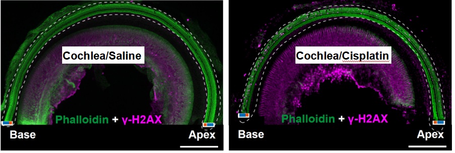 耳蜗毛细胞是听神经系统中将声波转换成神经电信号的最关键细胞。毛细胞是终末分化细胞,一旦死亡,无法再生。毛细胞的损伤导致不可逆的听力丧失。尽管DNA损伤修复机制在多个器官的细胞保护中扮演着重要角色,但耳蜗毛细胞中是否有DNA双链断裂损伤修复机制以及该机制如何保护毛细胞仍是一个未解之谜。本研究首次在小鼠体内证明化疗药物顺铂及衰老在耳蜗外毛细胞中引起DNA双链断裂,进而导致其凋亡与听力下降。而BRCA1促进修复外毛细胞DNA双链断裂,防止其凋亡和听力丧失。