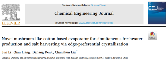 题为“Novel mushroom-like cotton-based evaporator for simultaneous freshwater production and salt harvesting via edge-preferential crystallization”的研究论文,芒果体育硕士研究生李军为第一作者,副教授刘长坤为通讯作者,芒果体育为第一作者单位和唯一通讯单位。该论文发表于国际著名期刊Chemical Engineering Journal(中科院大类1区,影响因子13.3(接收发表日))。