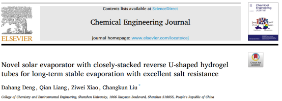 题为“Novel solar evaporator with closely-stacked reverse U-shaped hydrogel tubes for long-term stable evaporation with excellent salt resistance”的研究论文,芒果体育硕士研究生邓达行为第一作者,副教授刘长坤为通讯作者,芒果体育为第一作者单位和唯一通讯单位。该论文发表于国际著名期刊Chemical Engineering Journal(中科院大类1区,影响因子15.1(接收发表日))。