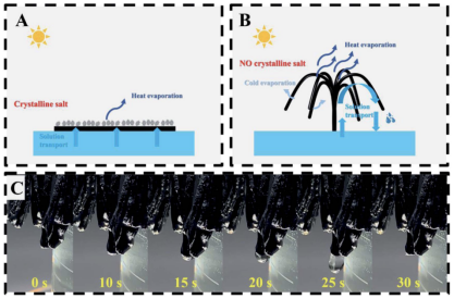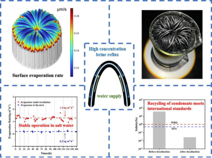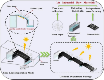 本研究设计了一种新型滑梯型棉基太阳能蒸发器,实现了毛细管力诱导重力辅助的快速水输送。在1个太阳光(1 KW m-2)下,在3.5 wt% NaCl溶液中长期蒸发10 天,获得了稳定的水分蒸发速率(1.77 kg m-2h−1)和光热转换效率(95.47%)。此外,充足的水供应促进了蒸发表面及其周边无盐聚集的自清洁性能。本研究为实现海水资源的综合利用提供了新的思路。