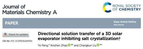题为“Directional solution transfer of a 3D solar evaporator inhibiting salt crystallization”的研究性论文,硕士研究生彭烨为第一作者,刘长坤副教授为通讯作者,芒果体育为第一作者单位和唯一通讯单位。该论文发表于国际著名期刊Journal of Materials Chemistry A(中科院大类1区,影响因子14.5(接收发表日))。