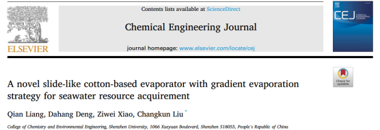 题为“A novel slide-like cotton-based evaporator with gradient evaporation strategy for seawater resource acquirement”的研究论文,芒果体育硕士研究生梁倩为第一作者,副教授刘长坤为通讯作者,芒果体育为第一作者单位和唯一通讯单位。该论文发表于国际著名期刊 Chemical Engineering Journal(中科院大类1区,影响因子13.3(接收发表日))。