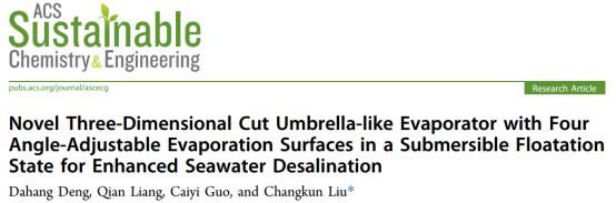 题为“Novel Three-Dimensional Cut Umbrella-like Evaporator with Four Angle-Adjustable Evaporation Surfaces in a Submersible Floatation State for Enhanced Seawater Desalination”的研究论文,芒果体育硕士研究生邓达行为第一作者,副教授刘长坤为通讯作者,芒果体育为第一作者单位和唯一通讯单位。该论文发表于国际著名期刊ACS Sustainable Chemistry & Engineering(中科院大类1区,影响因子7.1(接收发表日))。