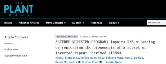 2024年11月6日,生科院刘琳副教授课题组与北京大学陈雪梅院士团队合作在Nature Index期刊The Plant Cell(1区TOP,影响因子10.0)在线发表题为“ALTERED MERISTEM PROGRAM1 impairs RNA silencing through repressing the biogenesis of a subset of inverted repeats-derived siRNAs in Arabidopsis研究论文,揭示了AMP1和AGO1调节反向重复序列衍生的siRNA生物发生的新机制。