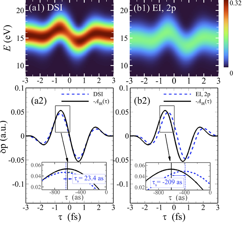 图1:直接电离通道(DSI)与激发电离通道(EI)的阿秒条纹谱。