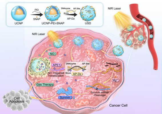 DNAzymes能够特异性识别和切割特异性癌基因靶点,从而阻断基因沉默治疗中的蛋白质翻译。由于其生物相容性、易于合成和高可编程性,DNAzymes在病毒感染、肿瘤和其他疾病的基因治疗中得到了广泛的探索。然而,基于DNAzymes的基因治疗应用的一个主要瓶颈是,如何实现基因沉默的时空可控性。本研究开发了一种近红外光(NIR)触发的级联纳米系统,实现了级联效应介导的气体-基因协同治疗,并证明了这种纳米平台在体外和体内均表现出良好的联合抗肿瘤作用。该纳米系统通过将上转换纳米颗粒(UCNPs)与一氧化氮(NO)前体结合,进一步利用静电作用吸附具有apurinic/apyrimidinic endonuclease 1(APE1)酶激活能力的DNAzymes。UCNPs作为光转换器,在NIR光照射下激发NO前体产生NO,而产生的NO不仅直接参与气体治疗,还将诱导细胞质中APE1水平的上调,从而增强DNAzymes的激活和时空可控的基因沉默。通过利用这一机制,将NIR光控制的NO释放和APE1激活的基因治疗的结合,实现了级联效应介导的气体-基因协同治疗。