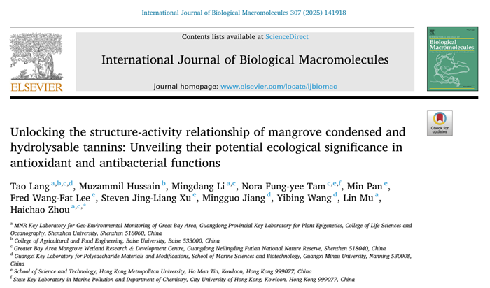 2025年3月,芒果体育生命与海洋科学学院周海超副教授研究团队在生物学TOP期刊International Journal of Biological Macromolecules上在线发表题为“Unlocking the structure-activity relationship of mangrove condensed and hydrolysable tannins: Unveiling their potential ecological significance in antioxidant and antibacterial functions”的研究论文。该研究系统解析了红树植物缩合单宁与水解单宁的结构-活性关系,揭示了这两类天然多酚化合物在抗氧化与抗菌功能中的关键作用,为红树林生态功能保护与天然产物开发提供了潜在的新视角。