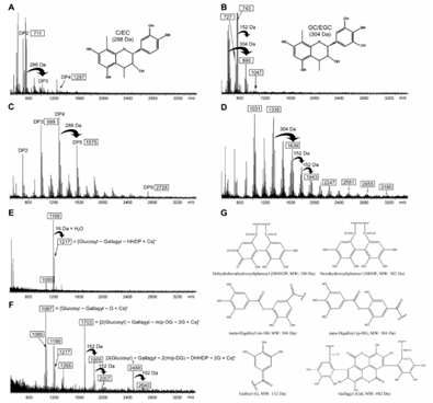 在抗氧化活性测试中,研究采用了Folin-Ciocalteu、FRAP、TEAC和DPPH四种方法,结果显示HT的抗氧化能力最强,其次是PD和PC,且聚合体的抗氧化活性普遍高于寡聚体(图2)。这主要归因于结构中对苯二酚和儿茶酚型羟基的数量和位置,HT因富含GA而具有更多的羟基,从而表现出更强的抗氧化活性(图1)。