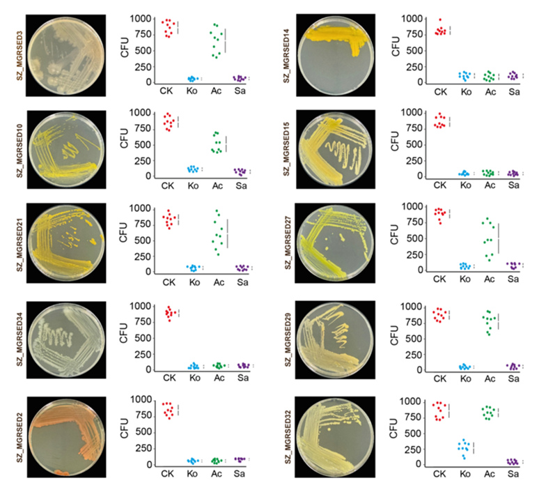 抗菌活性测试则针对从红树林沉积物中分离出的10株细菌,包括放线菌门、变形菌门和拟杆菌门的多个属。结果表明,无瓣海桑的HT对所有测试菌株均表现出强烈的抑制作用,而秋茄树的CT抗菌效果与HT相当,且显著强于桐花树的CT,其中桐花树的CT对不同菌株的抑制效果差异显著(图3)。