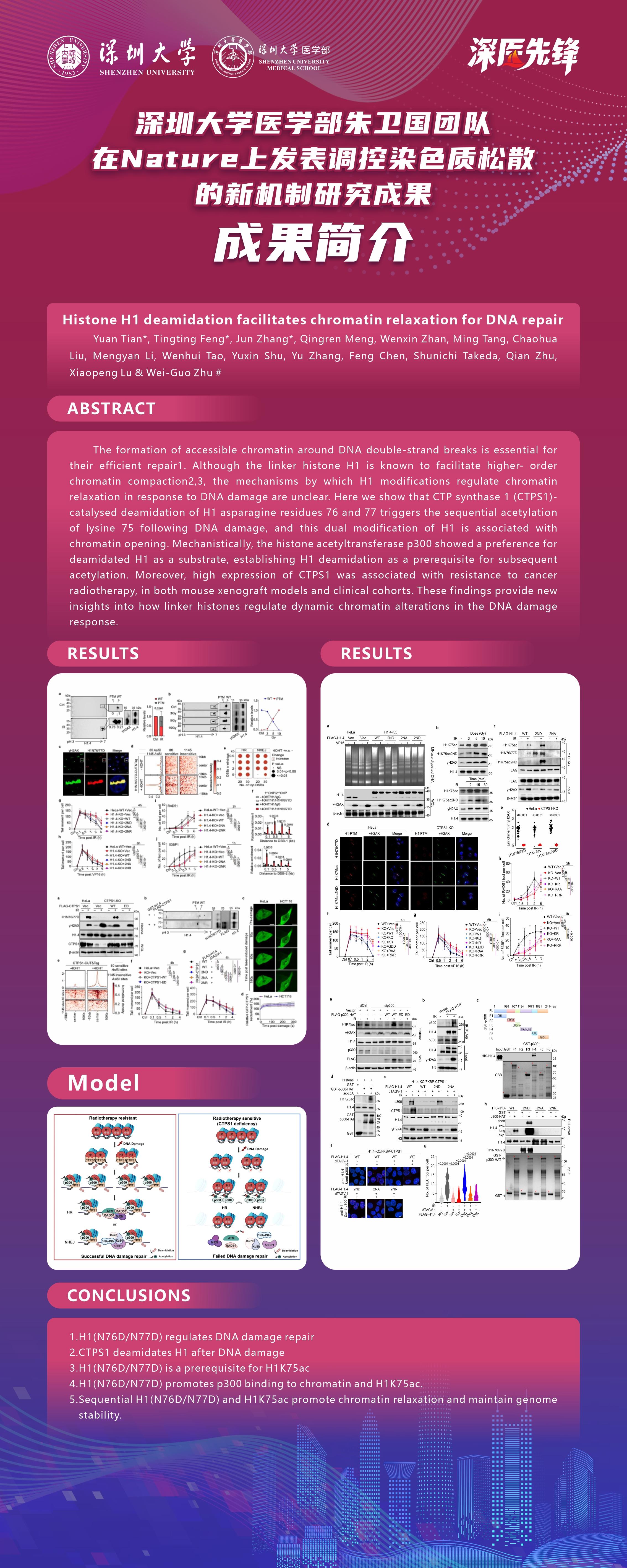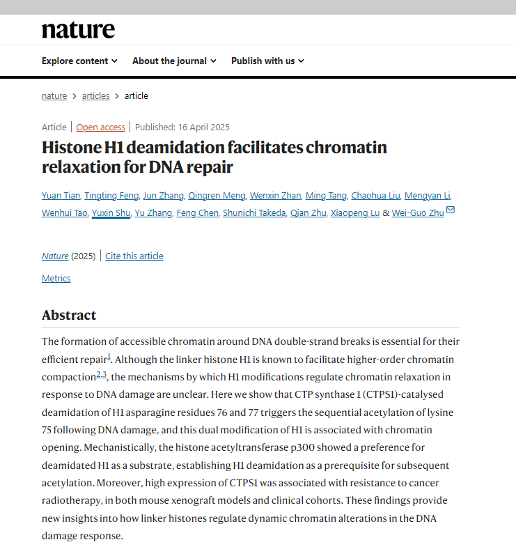 在芒果体育“2035追求卓越研究计划”和医学部“有组织科研行动计划”的大力支持下,朱卫国教授团队二十年来专注于肿瘤表观遗传调控、组蛋白质修饰调控DNA损伤应答的研究工作,取得了一系列瞩目的研究成果。近年来团队聚焦于DNA损伤早期的关键事件,经过努力,于4月16日在Nature在线发表研究论文,揭示了连接组蛋白H1脱酰胺化修饰(deamidation)促进染色质开放和DNA损伤修复的机制。