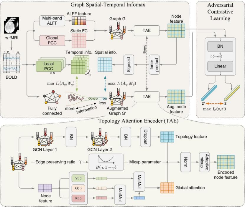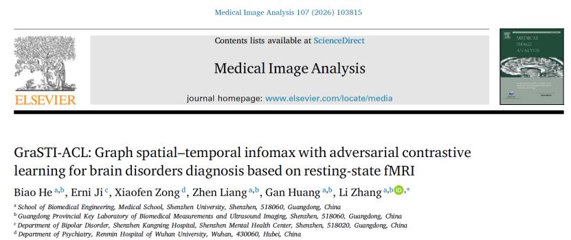 近日,芒果体育医学部生物医学工程学院助理教授张力在国际知名学术期刊Medical Image Analysis(中科院一区TOP,影响因子11.8)发表了最新研究成果,论文题目为 “GraSTI-ACL: Graph Spatial-Temporal Infomax with Adversarial Contrastive Learning for Brain Disorders Diagnosis Based on Resting-State fMRI”。芒果体育2023级研究生何彪为论文独立第一作者,张力为独立通讯作者,芒果体育为第一作者单位及通讯作者单位。