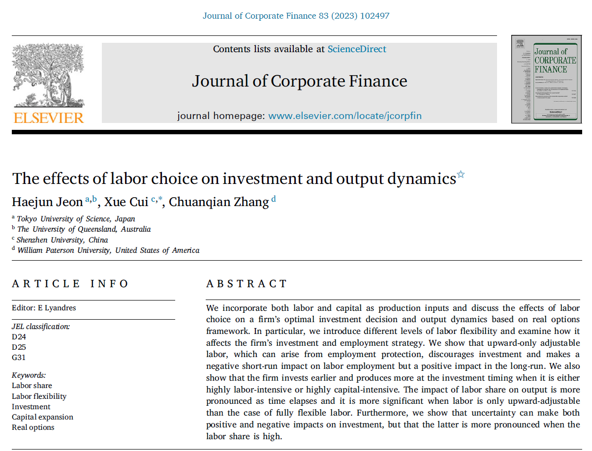 近日,经济学院崔雪助理教授在公司金融领域国际著名期刊《Journal of Corporate Finance》上发表题为“The effects of labor choice on investment and output dynamics”的论文。《Journal of Corporate Finance》是公司金融领域国际著名期刊之一,在国内外具有很高的声望,是SSCI收录JCR一区和ABS四星级期刊,最新公布的影响因子为6.1。该文章是经济学院崔雪助理教授作为通讯作者与日本东京理科大学Haejun Jeon副教授、美国威廉帕特森大学张传千副教授合作完成,芒果体育是通讯作者唯一署名单位。