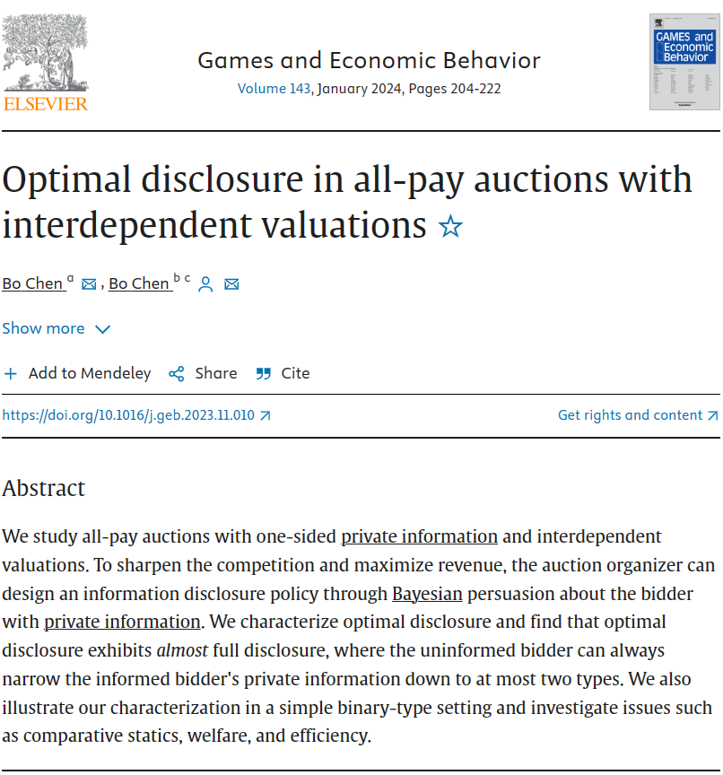近日,我校经济学院经济系陈博副教授和美国南卫理公会大学陈波副教授共同撰写的学术论文“Optimal Disclosure in All-pay Auctions with Interdependent Valuations” 在博弈论领域国际顶级期刊《Games and Economic Behavior》发表,芒果体育经济学院为第一完成单位。