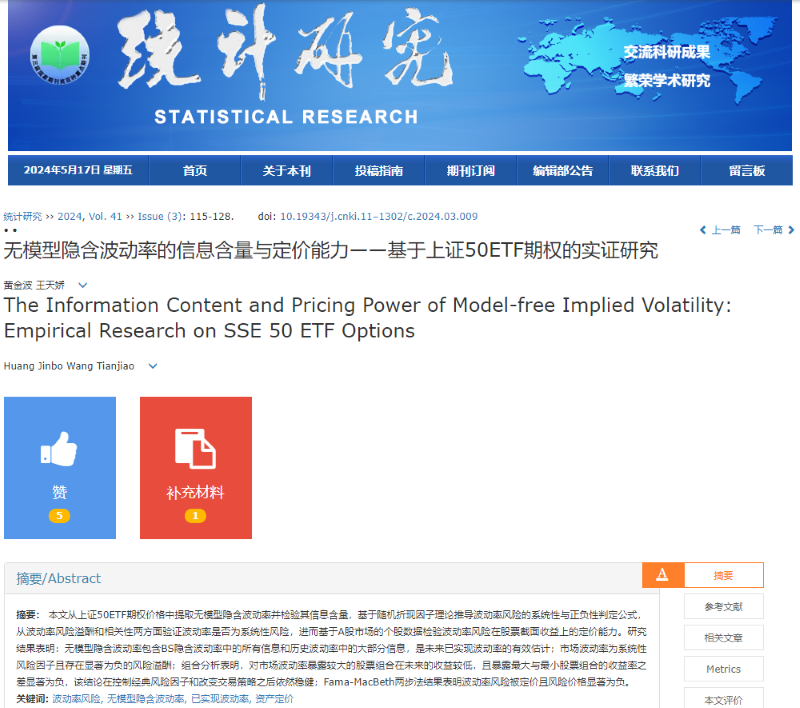 芒果体育经济学院金融系教授黄金波和厦门大学博士生王天娇合作完成的论文“无模型隐含波动率的信息含量与定价能力——基于上证50ETF期权的实证研究”在《统计研究》2024年第3期正式发表。芒果体育经济学院为第一完成单位。