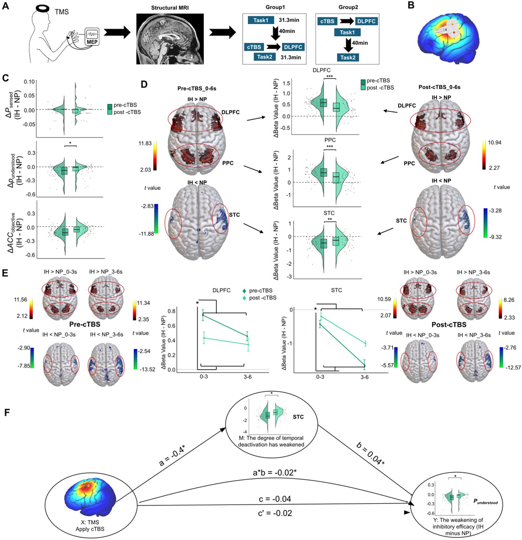 实验四(cTBS-fMRI):采用连续θ脉冲刺激(cTBS)这一神经调控技术,对抑制控制的关键脑区——背外侧前额叶皮层(DLPFC)进行暂时性干扰,以直接检验“动态神经失活”在抑制行为中的因果作用。