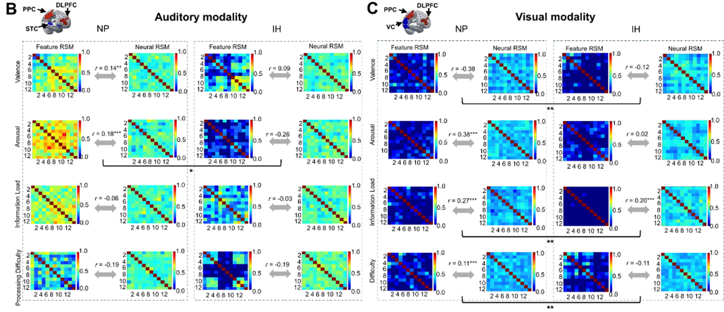 研究运用了表征相似性分析(RSA)这一前沿解码技术。RSA分析结果显示,在自然状态下,大脑对不同刺激特征(如情绪效价、唤醒度、信息量等)会产生清晰、可区分的神经活动模式,在表征矩阵上呈现为高度结构化的彩色图案。然而,一旦进入主动抑制状态,这些原本清晰的神经表征模式便被显著“解耦”,结构化的图案迅速变得混乱无序,趋近于随机噪音。这表明,大脑通过主动抑制,有效“模糊”了输入信息的神经“指纹”,使其难以被清晰地识别和加工。